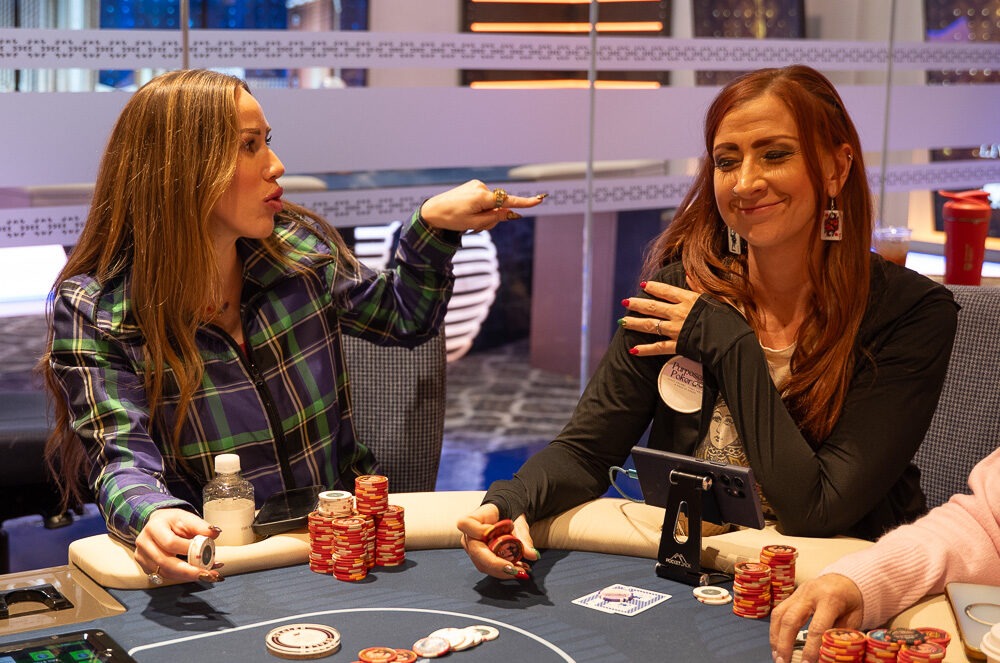 The river brings the final card 3♥. No player improves and Lonis’s A♣Q♦ stands strong. His pair of queens with top kicker secures the entire multiway pot. Chips are pushed his way as he surges into the lead. Tilly, failing to connect with the board, remarks that this will be her last rebuy before the next hand is dealt.