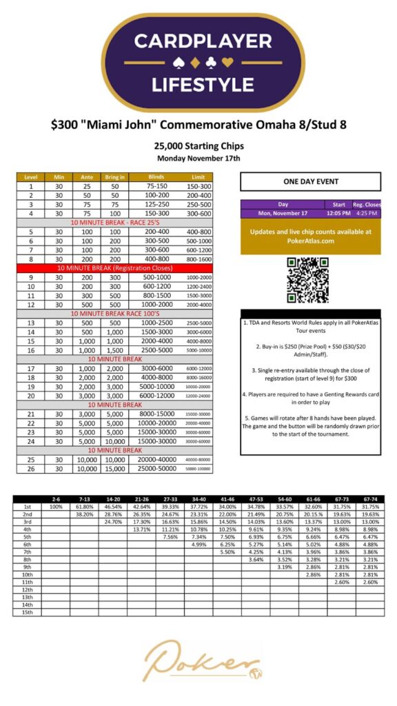 We will be covering the OE event at Resorts World on Monday November 17th starting at noon. Late registration is open until 4:25 pm for this one, and with thirty-minute levels you’ll still have a reasonable stack if you show up late. The dealers at Resorts World handle mixed games as well as any dealers we’ve ever seen because the biggest mixed games in town are hosted in the private rooms here.